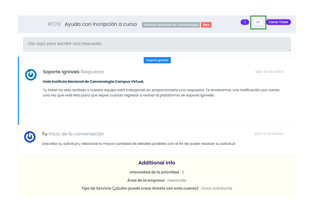 Luego de crear su ticket, podrá ver el detalle de este. También podrá ver el listado de tickets presionando en el botón marcado en la imagen.