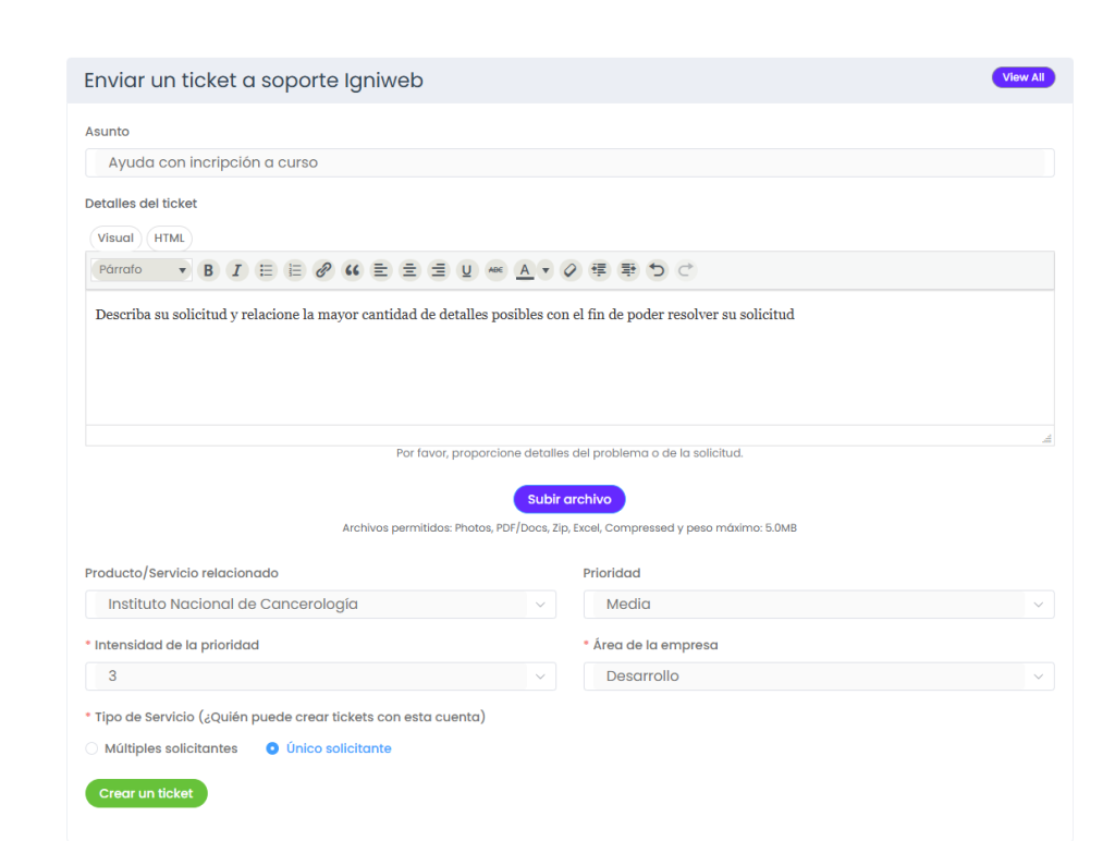 Para crear un ticket, presione el botón verde «Crear Un Nuevo Ticket», a continuación diligencie la información de su solicitud siguiendo el ejemplo, si es necesario adjunte los documentos necesarios.