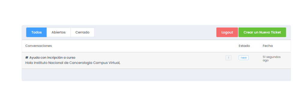 Luego de registrarse en nuestra mesa de ayuda, serás redirigido al panel principal donde podrás crear y gestionar tus solicitudes de soporte relacionadas con el campus virtual del ICN